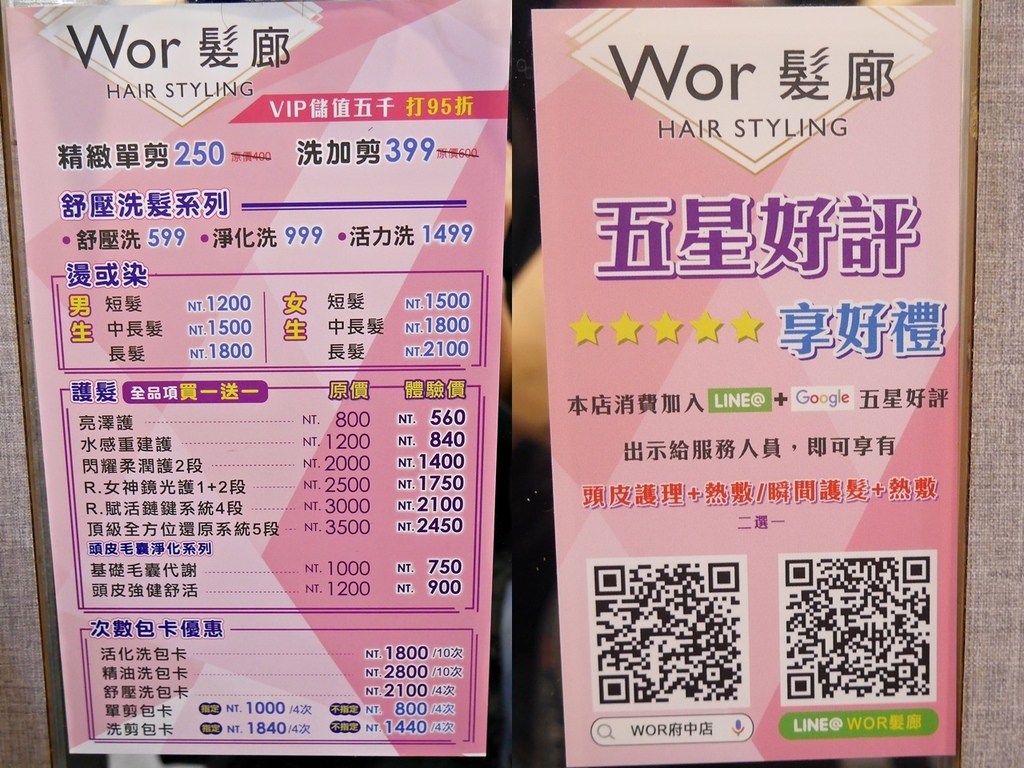 Wor 髮廊的每項服務都有明列在 Menu 內,實際價錢與其他服務依店內公告為主,現在還有五星好評就可以獲得好禮。