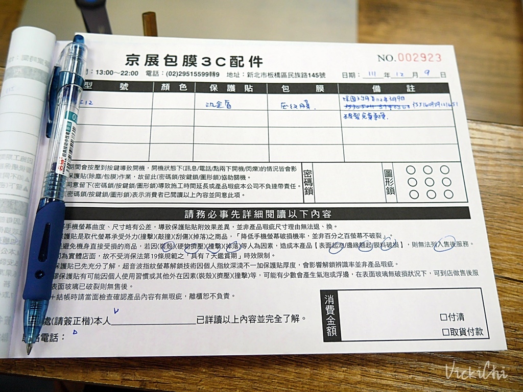 貼好手機保護貼和手機包膜,店員給我一張收據。汎金盾保護貼提供3個月保固,只要在保固期內發生螢幕保護貼出現破損的狀況,就可以免費換新的螢幕保護貼,品質安心有保障。不得不說,京展包膜真的是物超所值的店家。