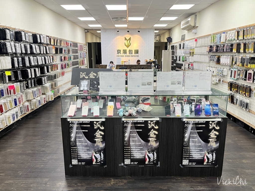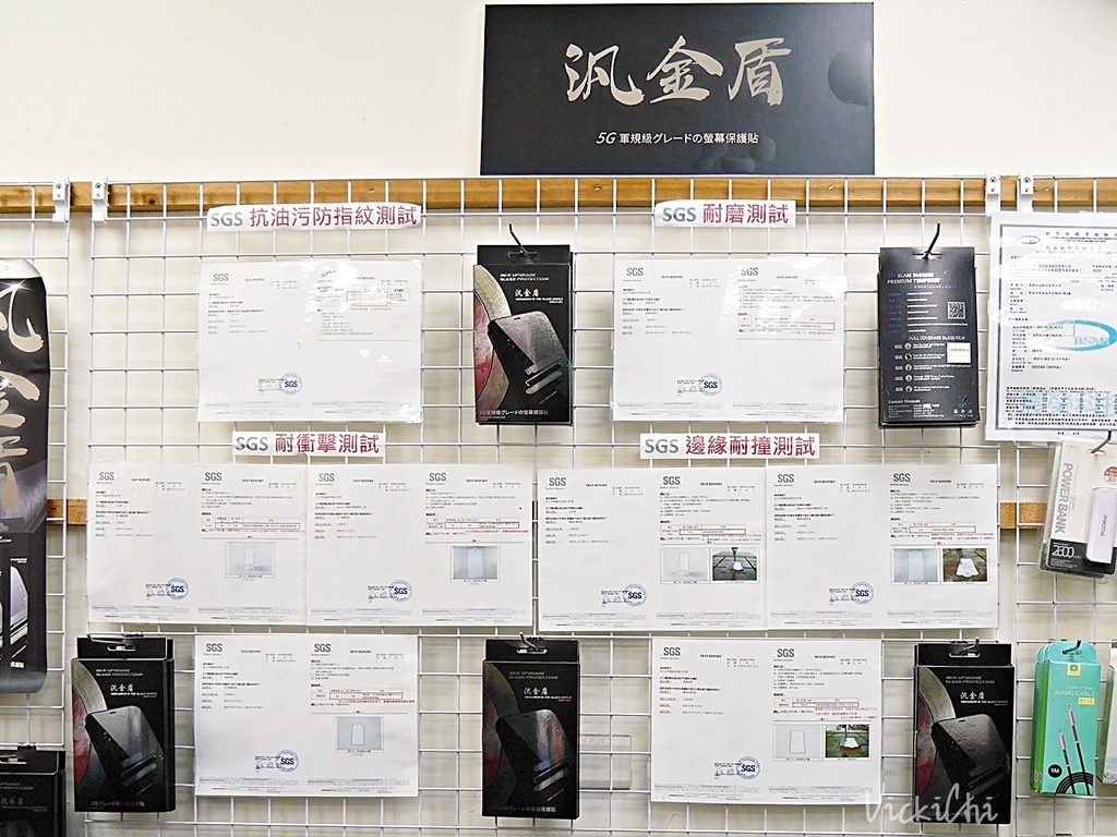 店內的架子上,放了汎金盾鋼化玻璃保護貼通過SGS各項嚴格測試報告,像是9H抗刮防爆、奈米電鍍塗層、強化邊緣耐撞,最重要的是這款保護貼還有三個月的保固,保固期間內破掉都可以免費換新的保護貼。