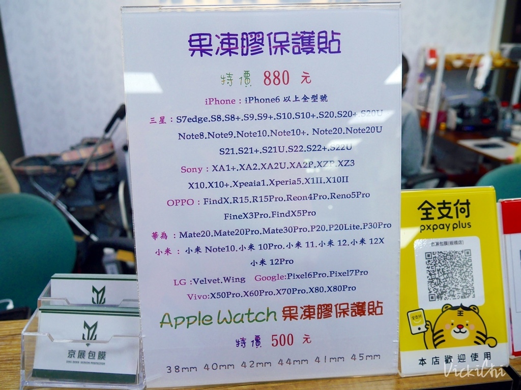 京展包膜提供很多種類的保護貼,其中,最受歡迎的就是汎金盾保護貼和果凍膠保護貼,一般果凍膠保護貼行情要破千,在這裡只要880元,Apple watch果凍膠保護貼則是500元。