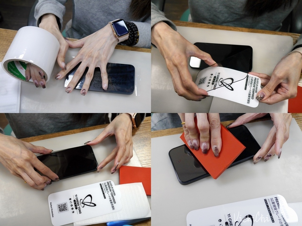 店員說明保護貼的效果後,開始用除塵膠帶清潔手機螢幕,確定螢幕上沒有任何灰塵後,就開始貼保護貼,店員仔細又熟練地的動作,整個過程非常迅速,不到十分鐘就完成。