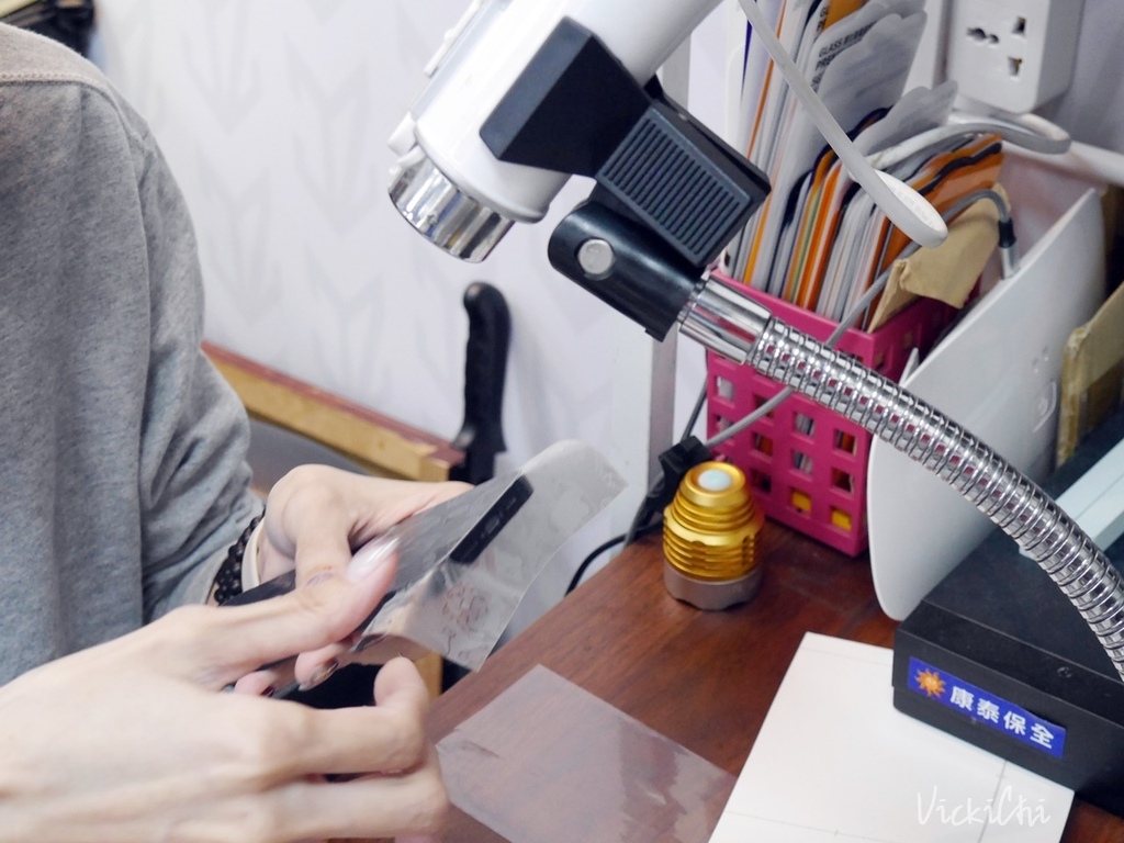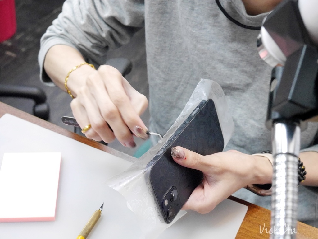 包膜前要先用除塵膠帶清潔手機,確認手機沒有任何灰塵後,開始手機貼膜。店員細心地用刀子劃開手機邊角、相機鏡頭、按鍵到每個洞口處都切割得精細,之後反覆用熱風槍雕塑,讓膜可以毫無空隙的服貼在手機表層。
