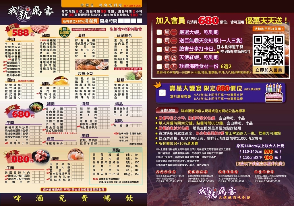餐點選擇有588、680、880三種不同價位(+10%服務費)的吃到飽,差別只在於可以無限續點的餐點種類。2小時的用餐時間,一次最多點八樣。現場加入會員點680價位的吃到飽,天天有優惠的活動。這次我們選680的價位,打卡分享就可享用北海道干貝吃到飽。