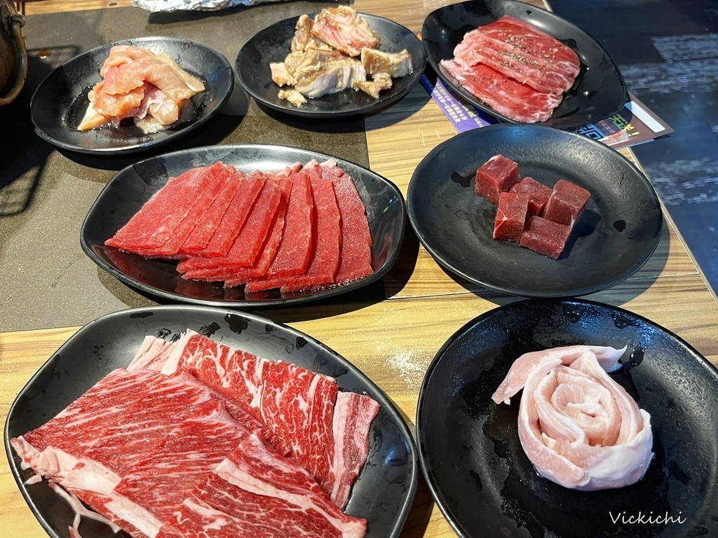 主打燒肉吃到飽,店餐規則一次點8盤,我們直接肉盤點好點滿,一盤的量會依照人數給量,吃不夠還可以再點,這樣既不會浪費食材也可以盡情地享用。食材一點完,店員馬上就送上桌。我喜歡的肉盤是松阪豬和骰子牛,肉質還不錯。