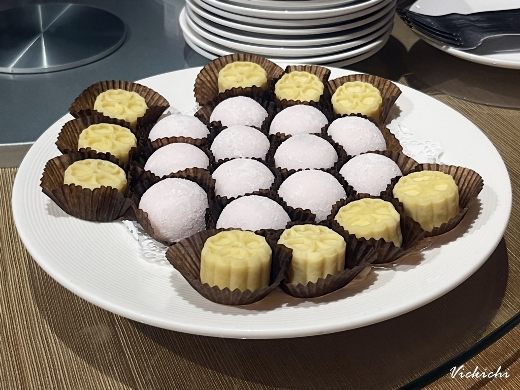 吃飽喝足後,最後就是來點甜點做為結尾!中間的花生大福,一咬才發現內餡是顆粒的花生粉內餡,但是我覺得皮蠻厚的,旁邊的好像是綠豆糕,吃到最後想不起來是啥?@@