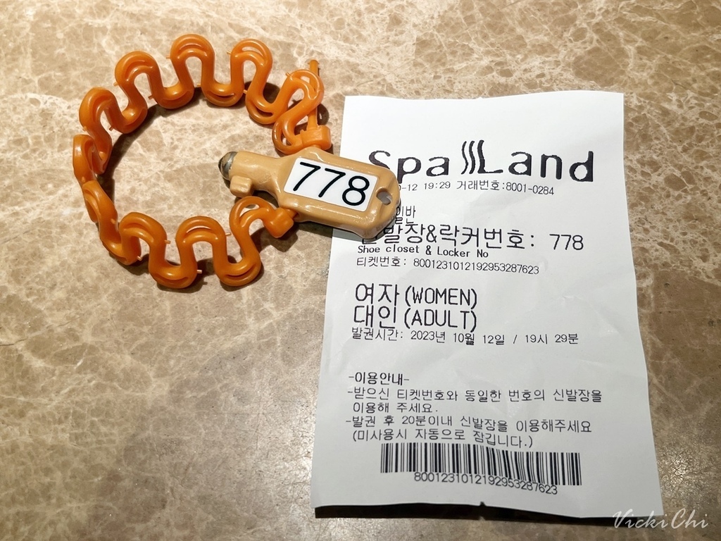 入場卷上有一組號碼就是對應的鞋櫃和置物櫃,把鞋子襪子一起放進去,鎖上櫃子拔下鑰匙,我把鑰匙套在手上。在Spa Land裡面消費買飲料或食物,只要出示鑰匙手環,最後出場的時候再一起結帳。