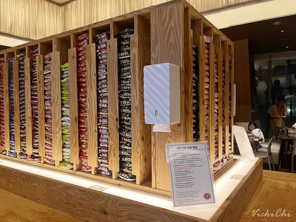 先到櫃台刷鑰匙圈的感應器,服務人員就會給一個碗和飲料(有可樂、水等可以選擇)。接著到泡麵牆挑選喜歡的泡麵口味,旁邊還有配料區可以挑選自己喜歡的配料。配料除了有火腿、蒟蒻、年糕等,沒想到竟然還有紅蛤!!!