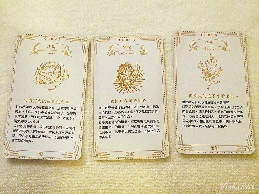 憑直覺抽取三張精油花卡,分別抽到玫瑰、雪松和茶樹。光看牌卡上面的解釋,玫瑰代表「愛」提醒我在埋頭苦幹的同時,記得打開心門給予愛,周遭是有很多人支持我的,雪松代表「勇氣」提醒我目前遇到困難的事情,我是有能力可以解決,只是暫時失去勇氣,而茶樹則代表「理解」跳脫出自己的框架去用別的角度去思考事情,從別的角度解決事情。