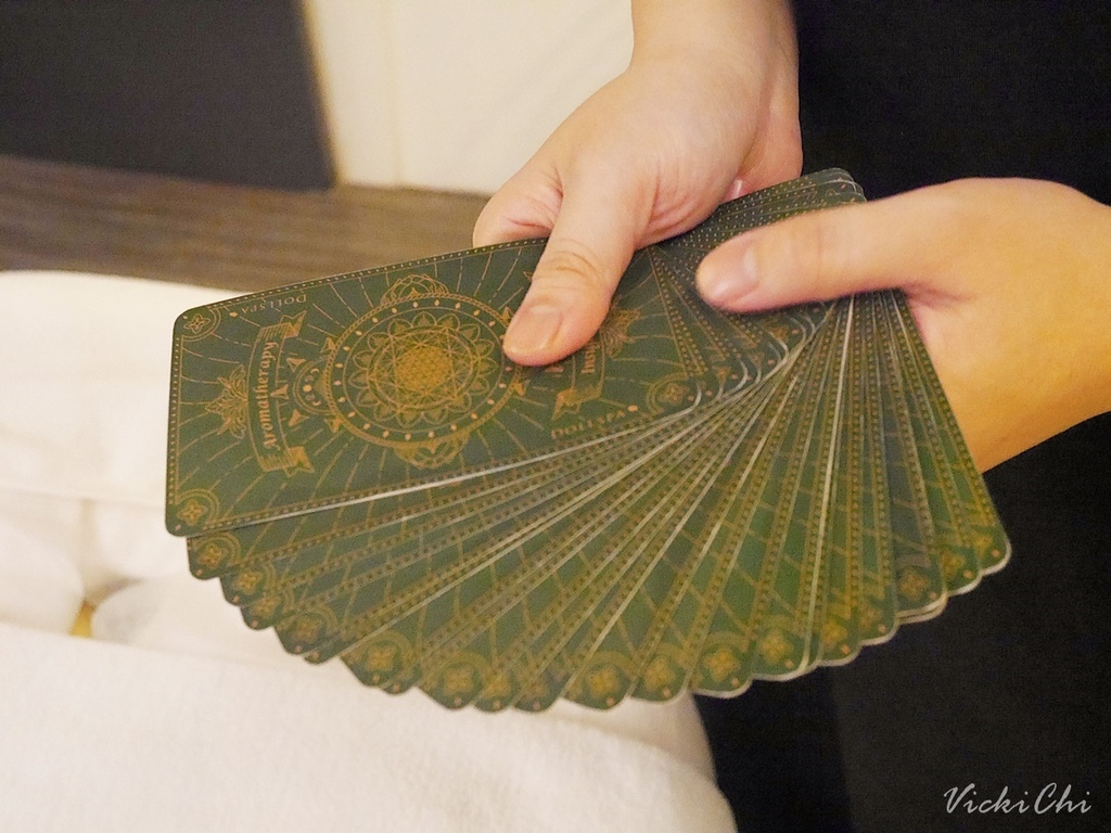 芳療師拿出精油花卡讓我抽取。每張花卡都代表一支精油,芳療師會透過抽到的精油花卡代表的精油和甜杏仁基底油做為這次按摩的精油,每次的春回花語舒壓SPA課程,使用的精油與香氣都不同。