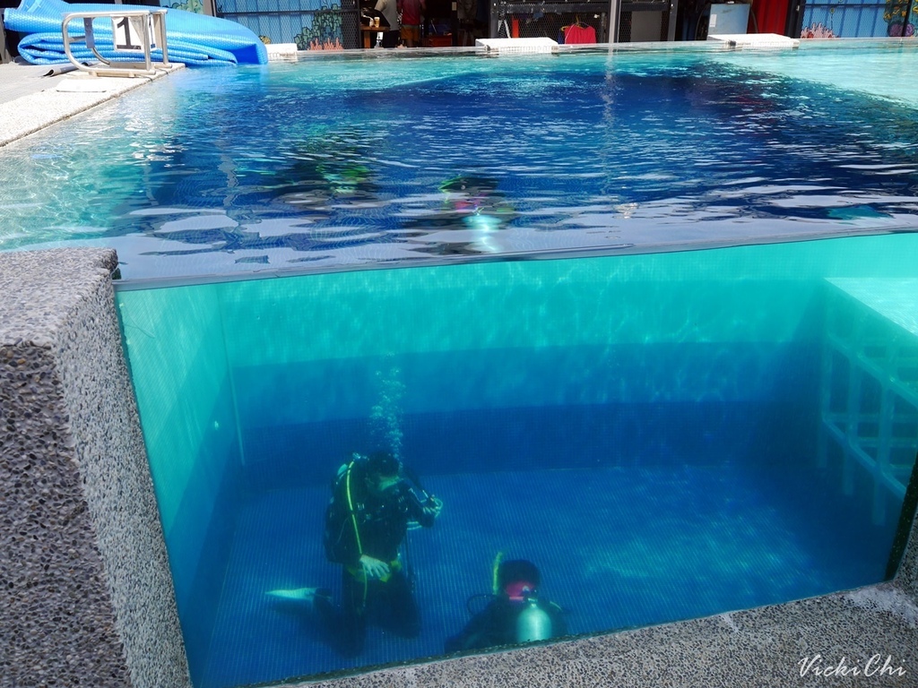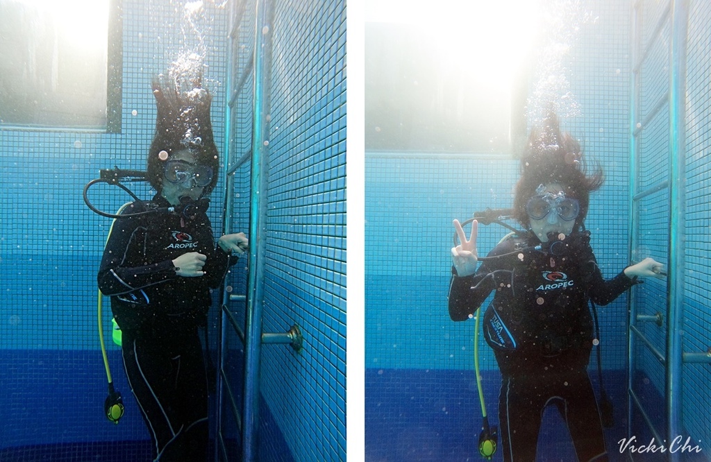 接著我們就要進泳池練習水肺潛水,把所有潛水設備背在身上,沉甸甸的重量,讓我站不太穩。(汗!)