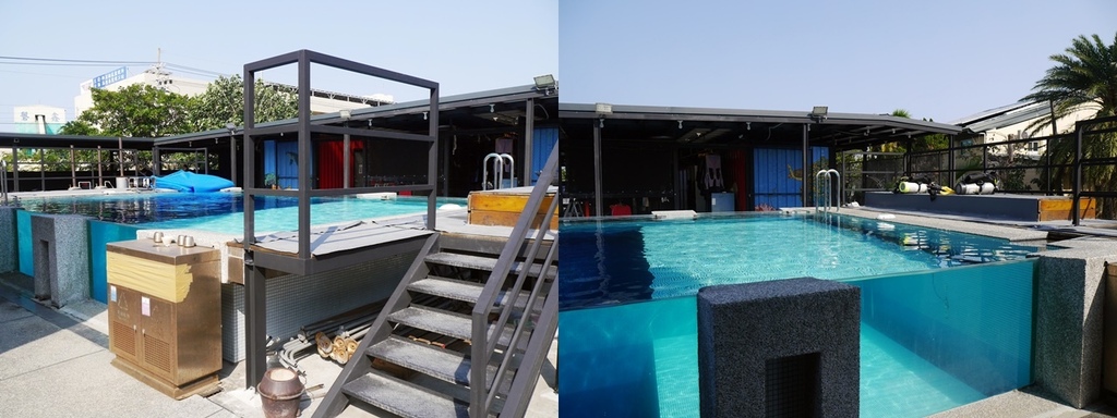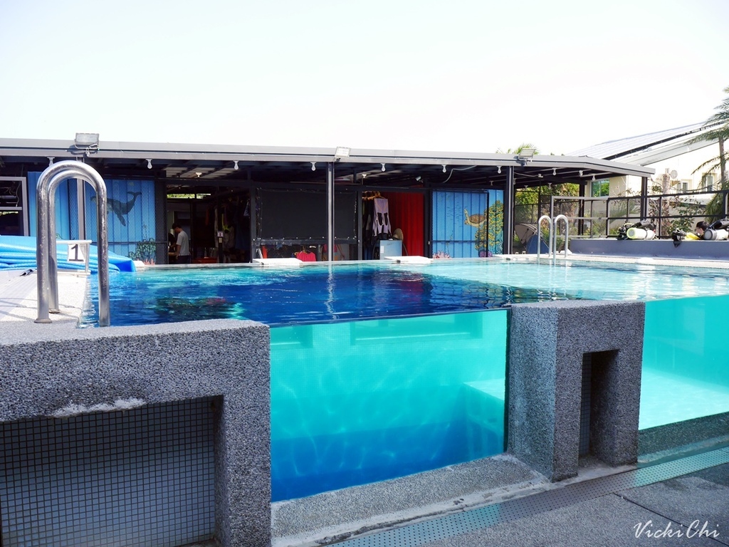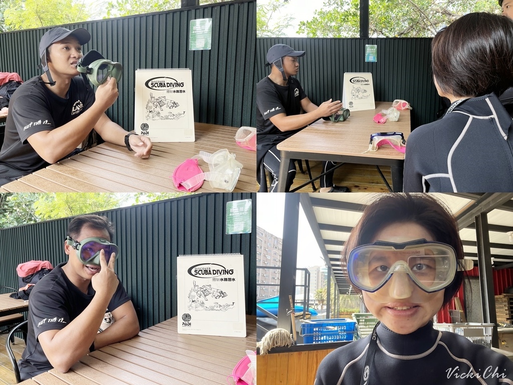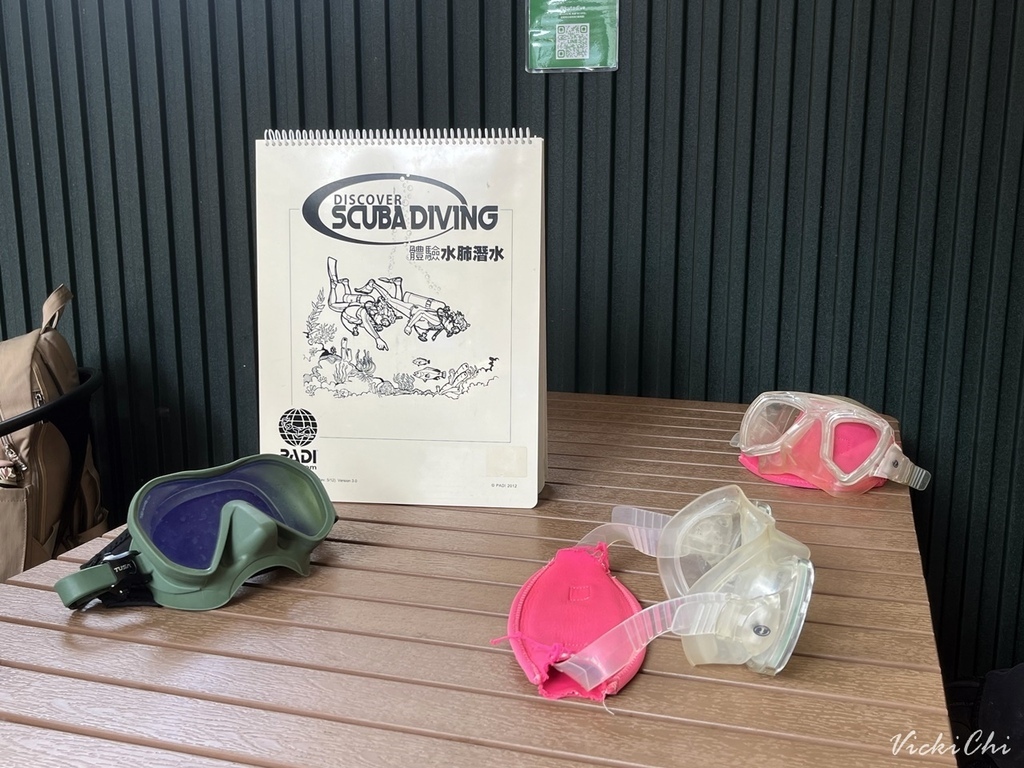 抵達潛水中心,中心有1.5米及3米潛水訓練池,看到訓練池裡面已經有人正在練習潛水。填完一些資料後,教練拿給我防寒衣和溯溪鞋,抱著期待且緊張的心情,我迅速換好裝備。教練幫我挑了面鏡,順便問我有沒有近視?有近視的話,可以配戴隱形眼鏡或是有度數的面鏡,就可以在水中清楚欣賞水中世界。