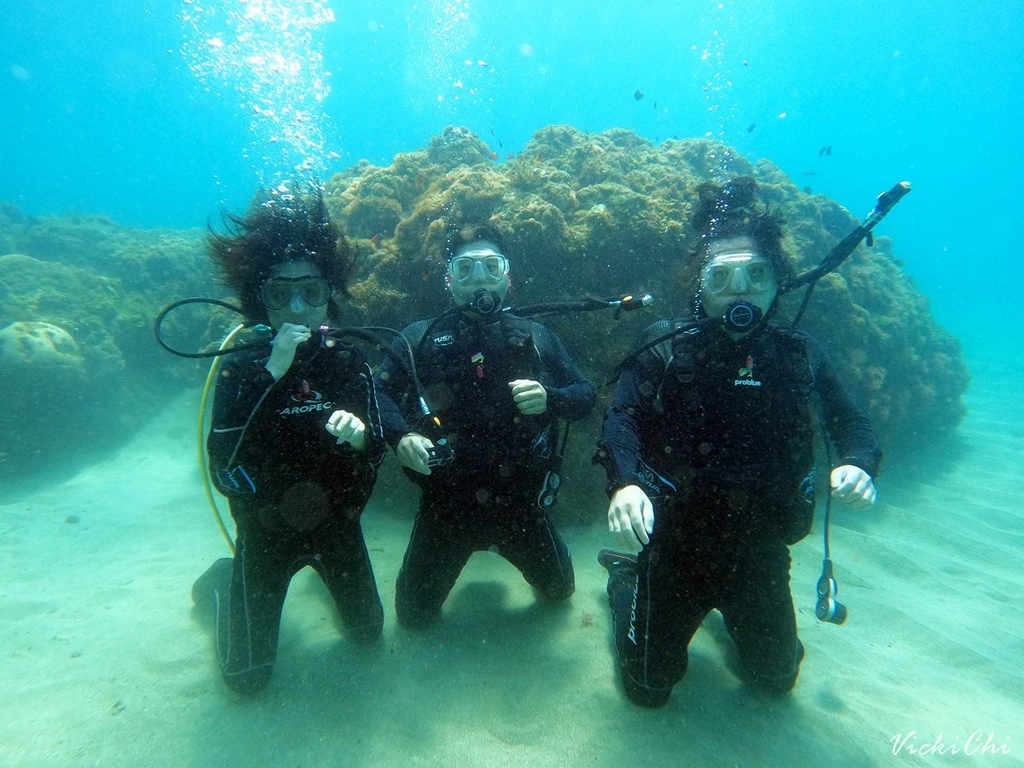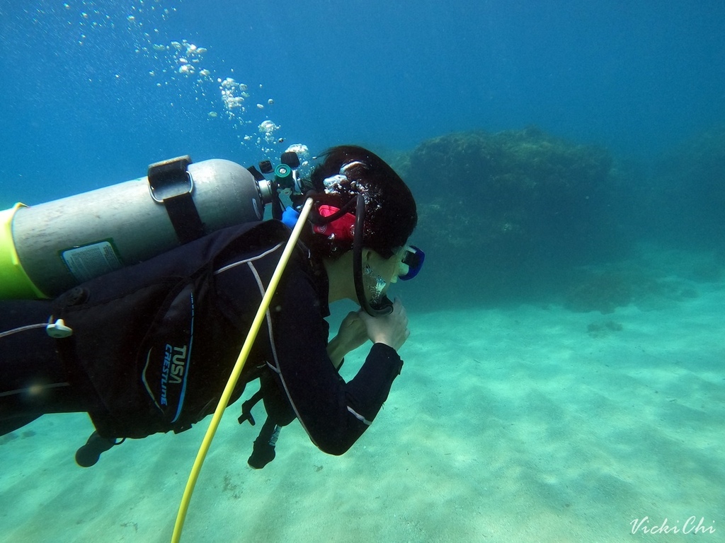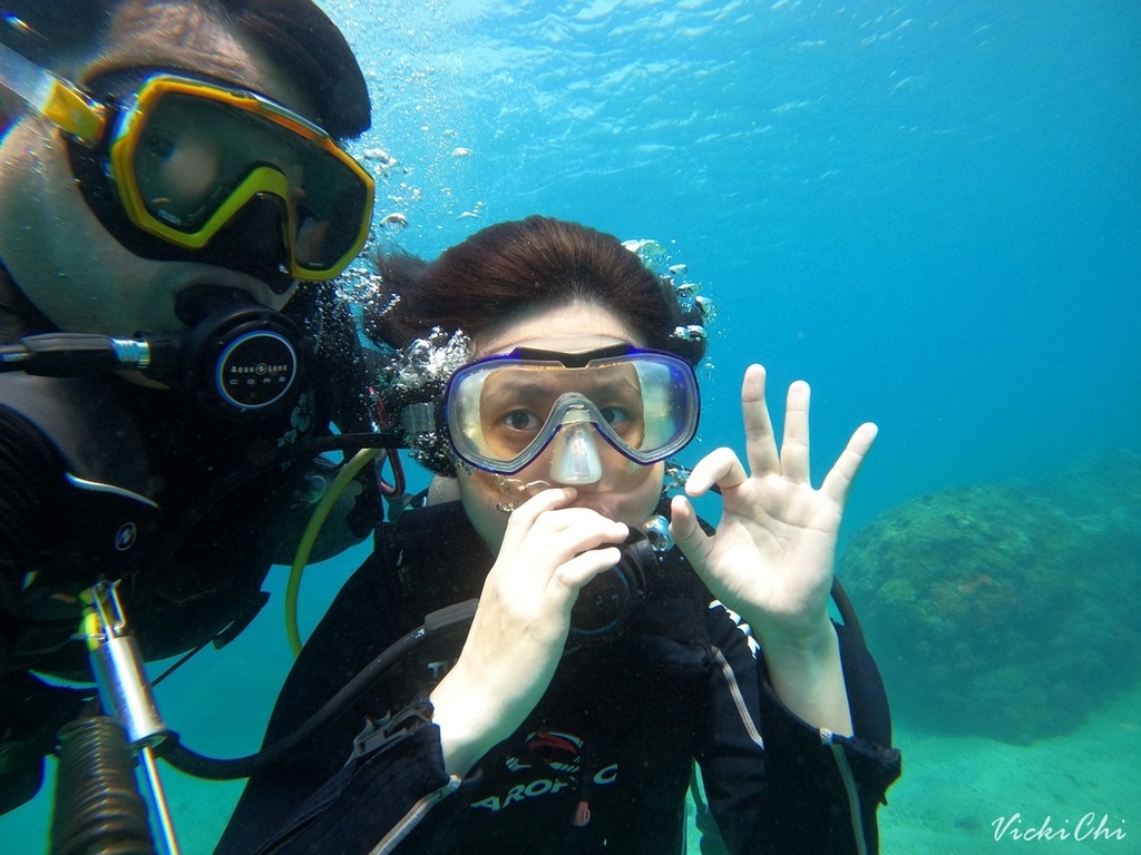 水肺潛水對潛水新手來說比較簡單,我是屬於不太會游泳,參加體驗水肺潛水的課程,跟著教練學習水中呼吸、耳壓平衡和水中國際通用的手勢就行了!