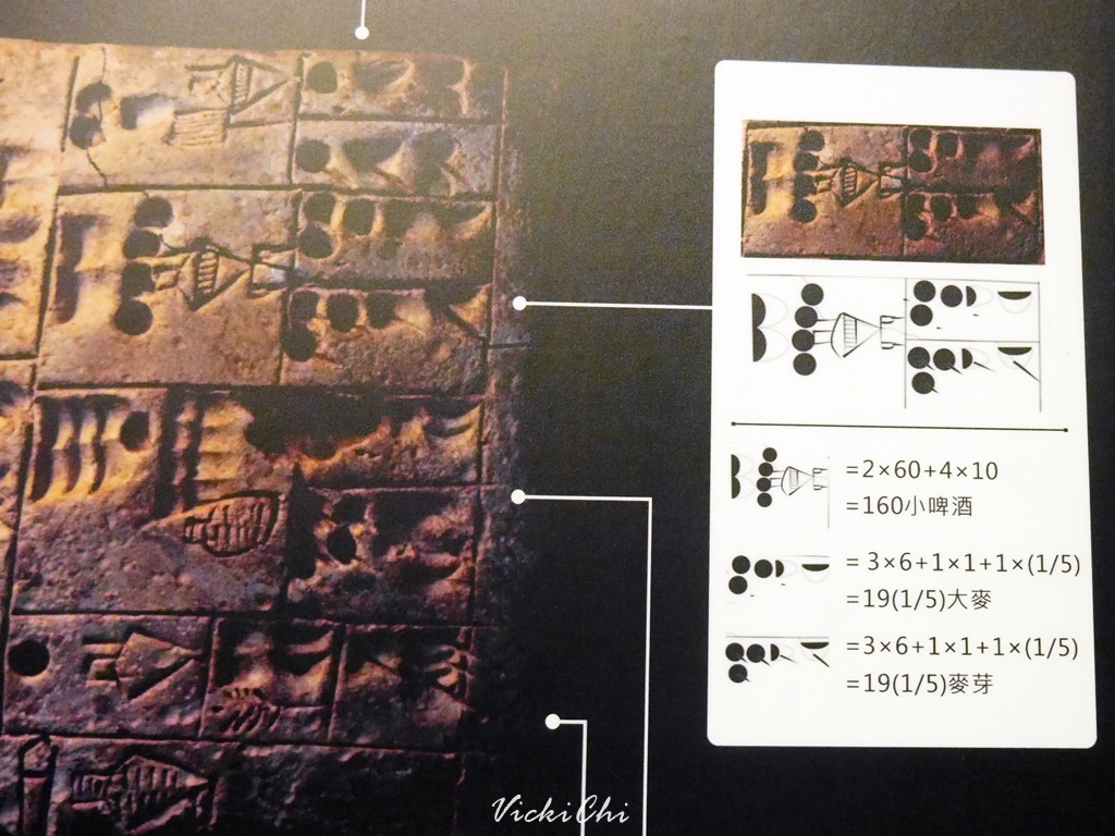 這裡還擺了一塊西元前的古波斯帝國的泥板上寫著:「有兩個人一起欠了某人將近13兩的銀子,最後用15桶啤酒抵債。」