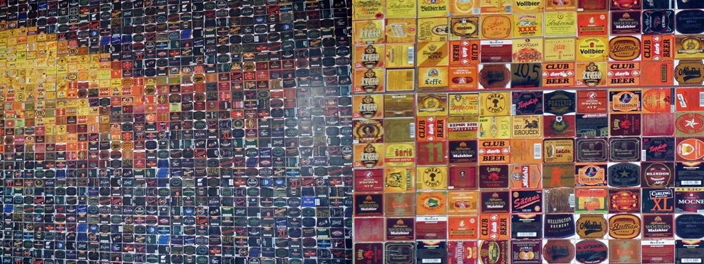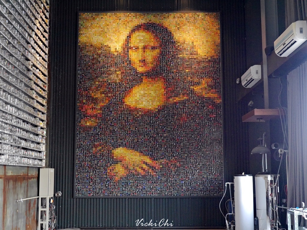 另一面引人注目的牆,則是巨幅世界名畫「蒙娜麗莎的微笑」,是館長用8400張啤酒酒標,花了三個月手工黏貼而成,當下看到這個畫面,超酷的!