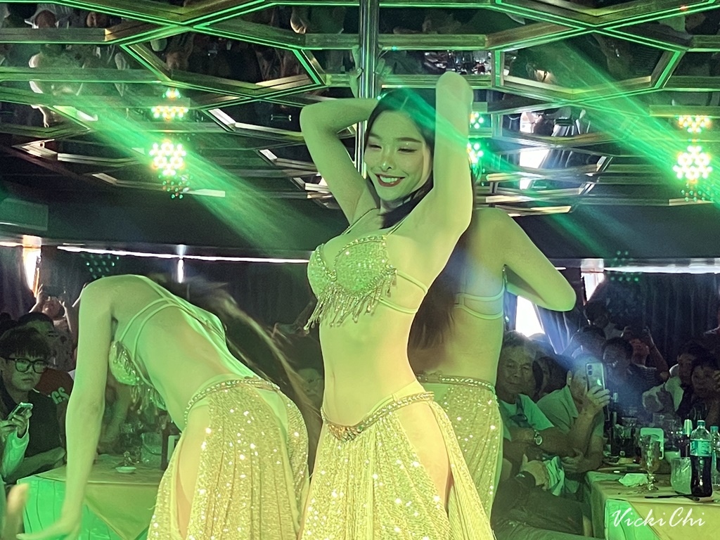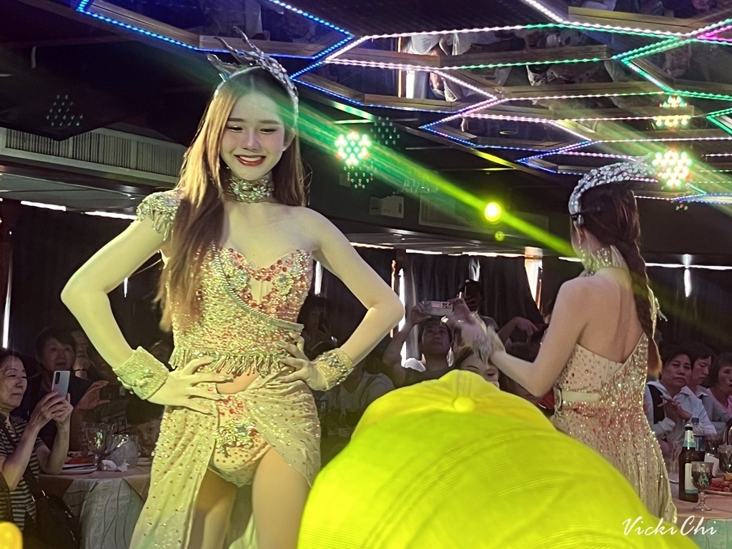 接著就是人妖表演秀的時間,這是我第一次看人妖表演秀,我一整個超興奮的,終於可以體會到導遊說船上的是妖皇等級,每個人妖都超漂亮的,看著他們精彩的表演還有讓我心兒砰砰跳的身體互動。
