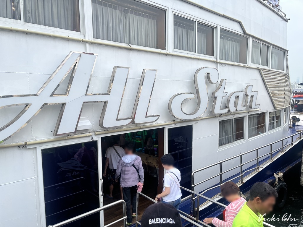 在E碼頭排隊燈船,碼頭有販售All Star全明星號遊輪的船票,自由行的話,我推薦直接線上購買比較划算,到現場直接換票就好!現場排隊人潮超多,比較不會手忙腳亂。這次跟著旅行團來,完全不用擔心這種混亂場面,跟著走就對了!
