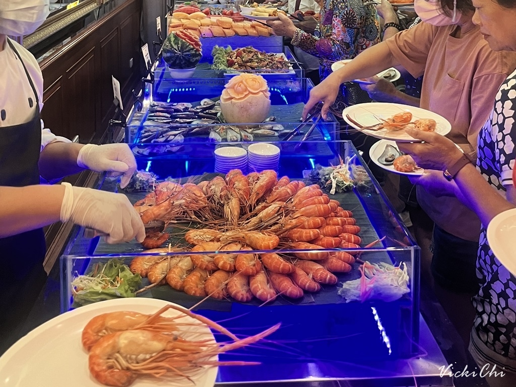 船上的餐點是海鮮總匯吃到飽,有兩排不同的海鮮、熟食和甜點可以自取,吃多少拿多少,海鮮吃起來算蠻新鮮的,我一連吃了很多泰國蝦跟生蠔。總之在船上絕對吃得非常飽。