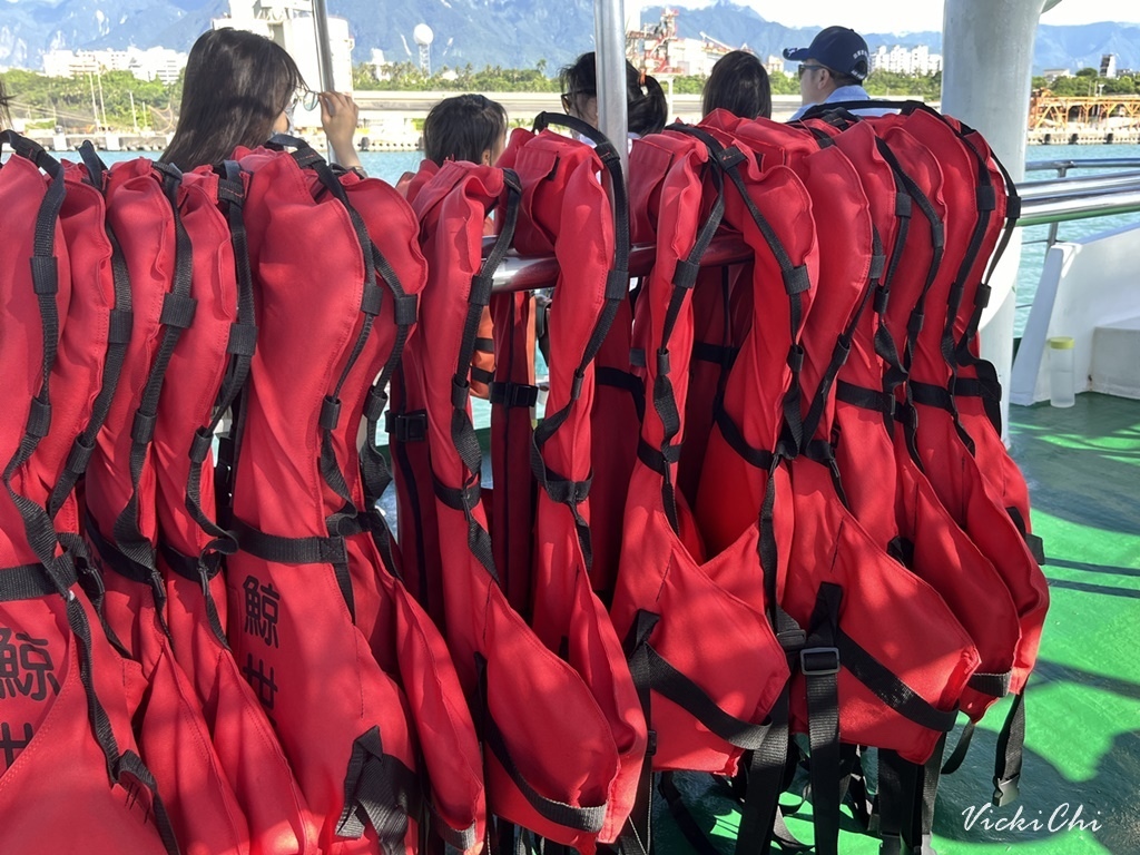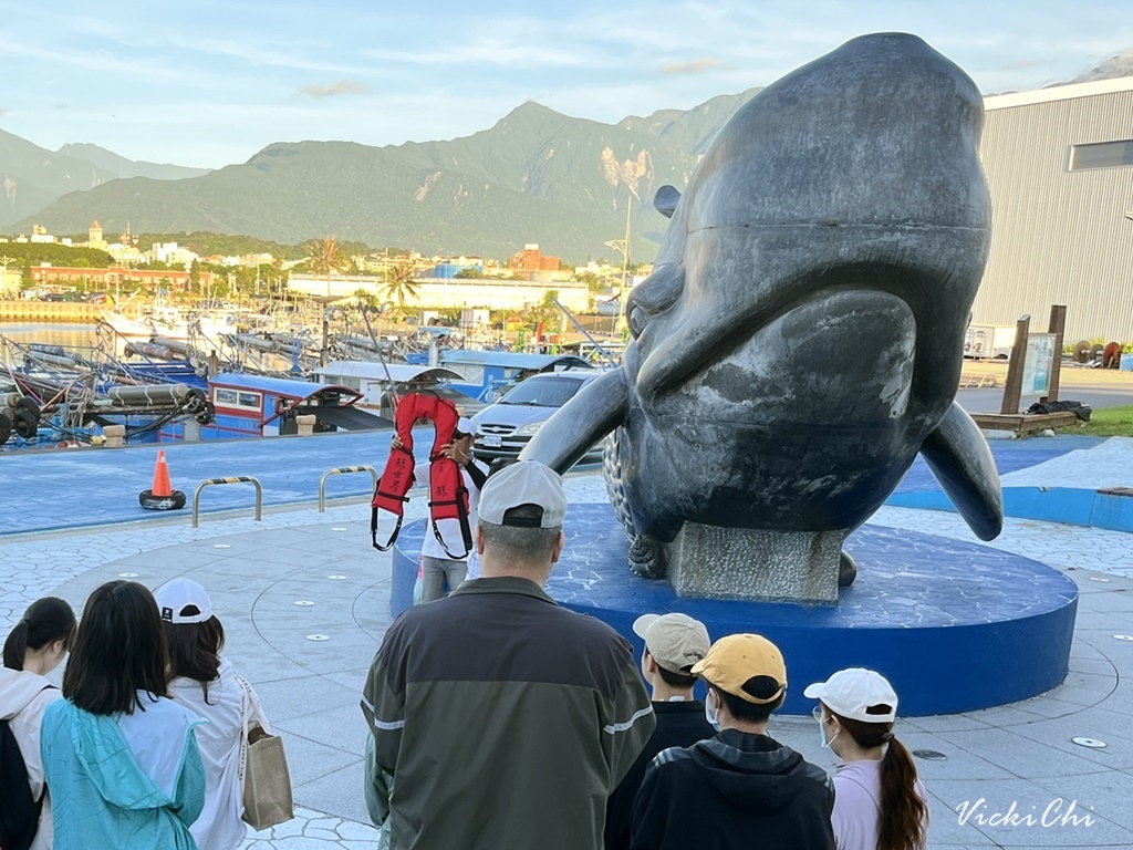 鯨世界賞鯨集合地點:在花蓮港碼頭的向日廣場,廣場上還有一隻超大鯨魚雕像。我們這次是開車前往漁港,碼頭旁備有大型免費停車場可以停車,蠻方便的!搭乘大眾交通運輸工具,可以事先預約接駁車,直接送到集合地點。在上船前,船員會先跟大家示範上船後怎麼穿救生衣。