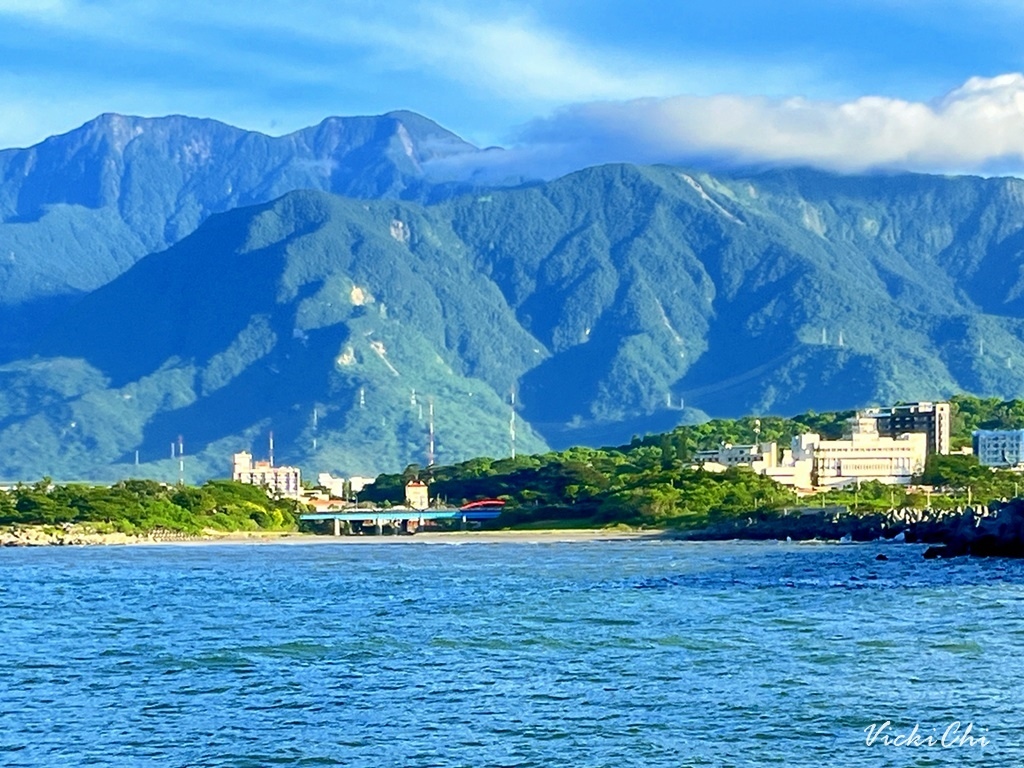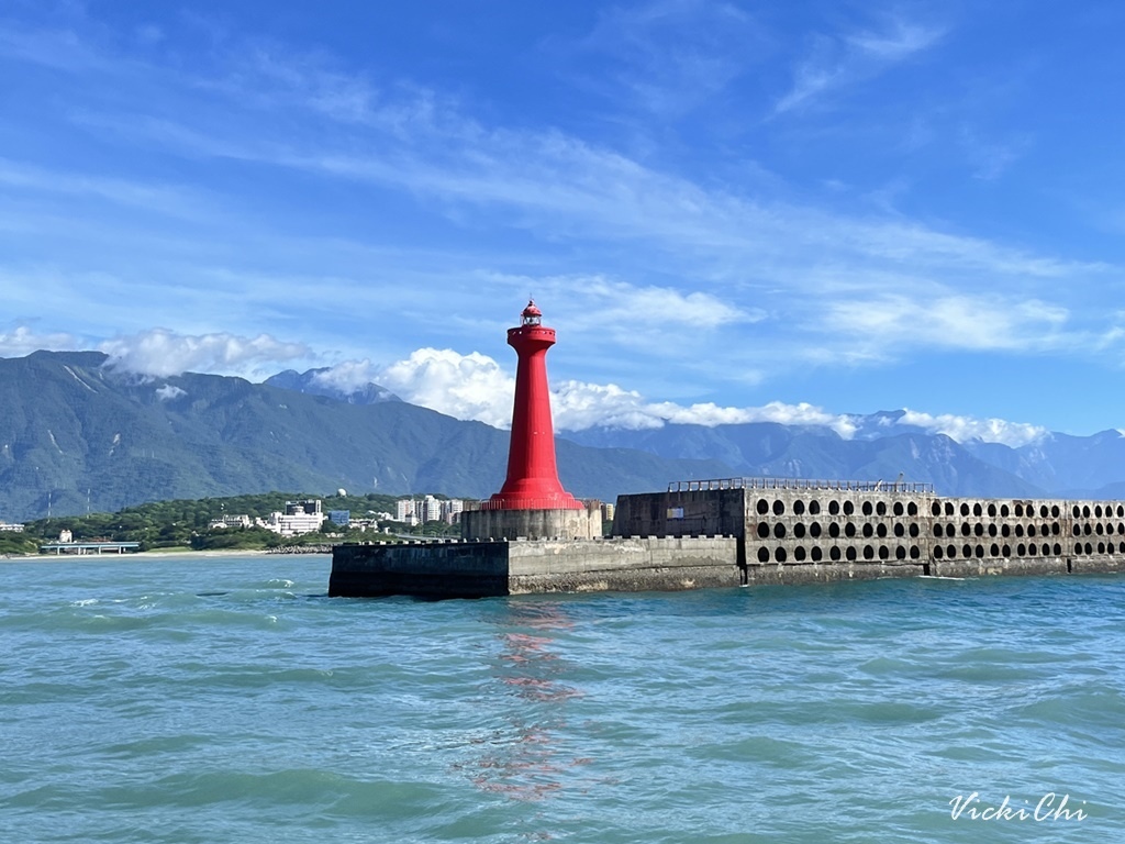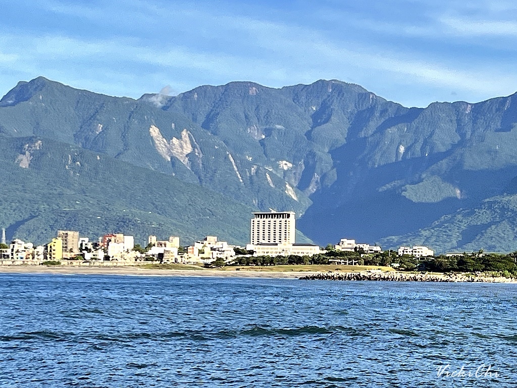 搭船出海就覺得好好玩,在海上往回看到花蓮港邊,是上次在海是生活節玩獨木舟的地點,頓時美好的回憶湧上心頭!哈哈哈~