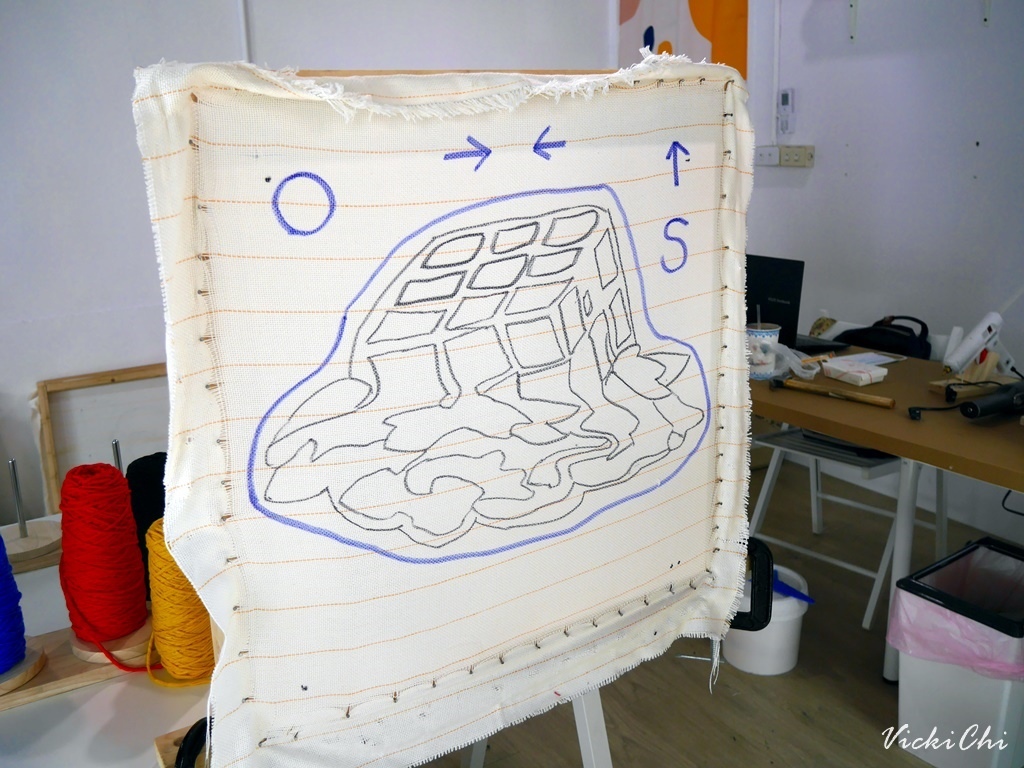 用簇絨槍打毛線的這面是地毯的「反面」,要到另外一邊才能看到實際的樣子。看著針織的痕跡,剛開始總覺得自己好像打壞圖案,老師說要到後面才會看到整個輪廓,我才放心繼續打下去。