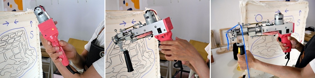 老師教我怎麼使用簇絨槍,簇絨槍必須跟布面貼合並保持垂直90度,如果角度不對,布很容易破掉。由下往上的織法,這樣才不會打結卡線。老師解說完後,就是我的練習時間,用簇絨槍在布的空白處,練習不同角度的技巧。