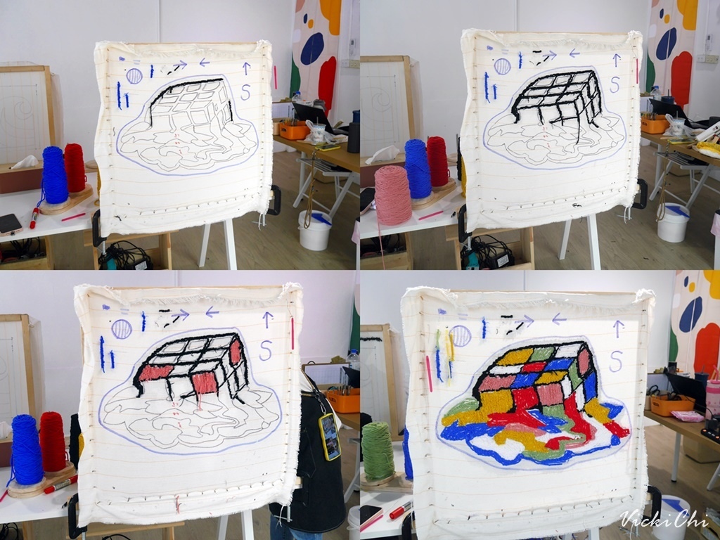 報名完成後,Does Art會傳審圖老師的line,把自己想做的圖傳給老師做審圖就可以!我在IG上看到融化的魔術方塊的手作地毯,覺得太有趣了!把圖傳給審圖老師,老師看了我的圖覺得線條太多,毛線的線條可能會因為太密集而沒辦法施作。於是,老師幫我想了一個比較簡單的類似的圖案來做。