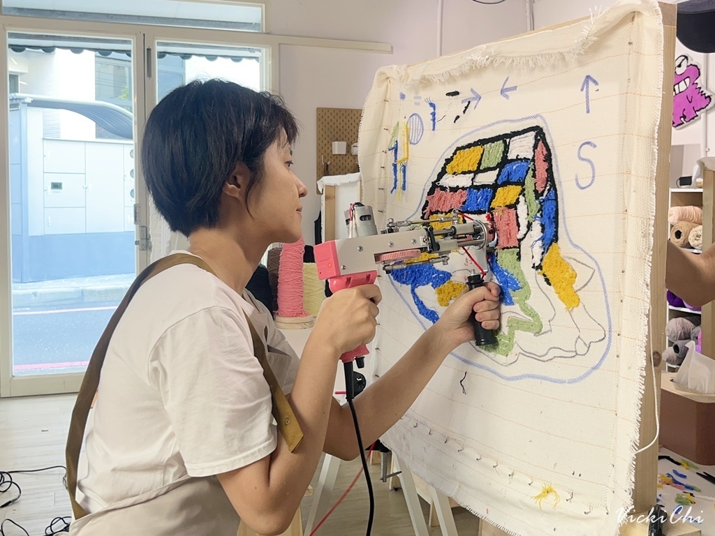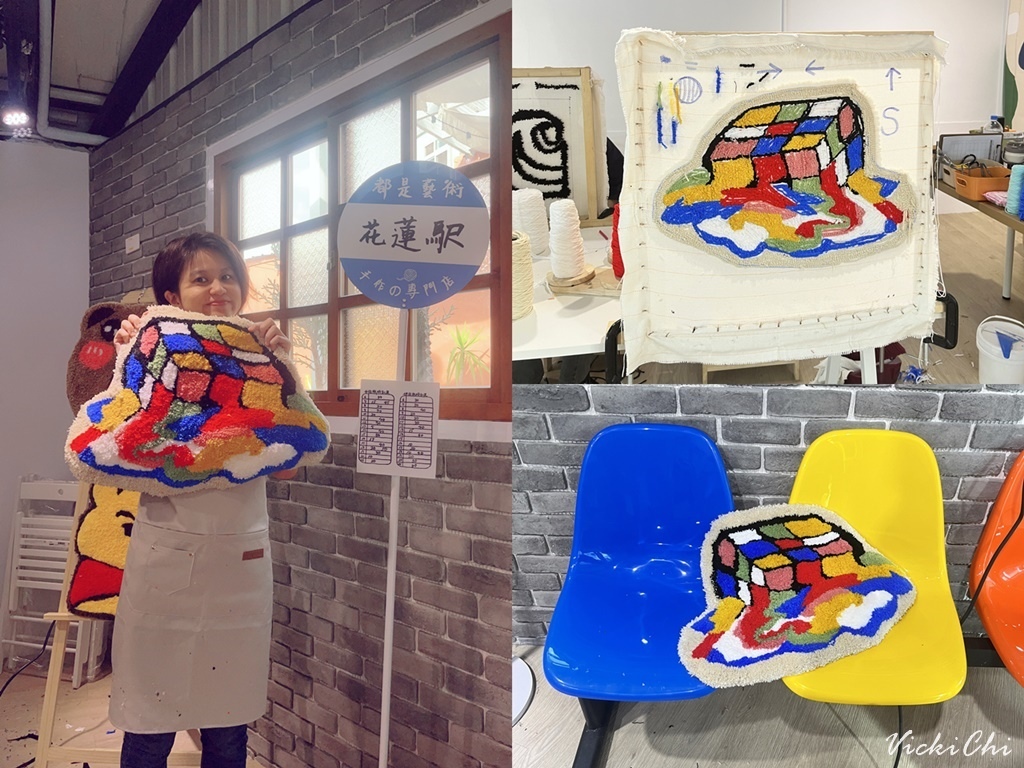 發現「DoesArt 都是藝術」在花蓮有店,假日直接預約起來!花了一個整天的時間,把自己喜歡的圖案變成毛茸茸的地毯,不得不說手拿著簇絨槍在畫布上「搭搭搭、搭搭搭」一槍一槍打出來的地毯,每次看都超有成就感~讚讚的。