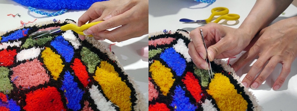 最後,老師使用調色刀在地毯上膠固定毛線和黏上止滑墊。