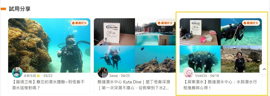報名大試用時代的試用活動,陸續成功入選和體驗商品。沒想到我有兩篇文章獲得編輯的嚴選好文的標籤,讓我覺得好開心喔!也透過試用活動,讓我體驗到我一直很想體驗的水肺潛水,還被編輯標為嚴選好文的肯定,超讚的啦!