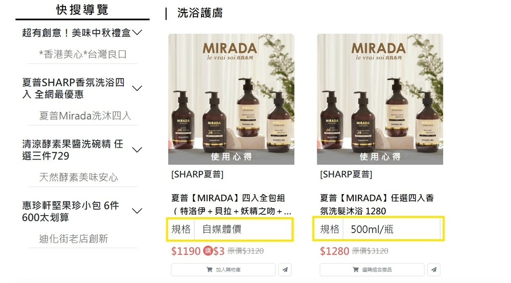在痞樂購Pixgo可以看到原價跟自媒體價的價差,以最近深得我心的MIRADA洗沐商品,任選四瓶跟全包四瓶,在網站上的價格都是1280元,如果使用自媒體價就可以用比較便宜的價錢購入,還能直接從購物金裡面扣除,商品圖上還有試用心得可以看!