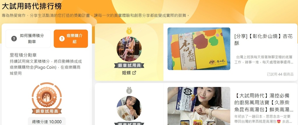 在大試用時代裡面有積分排行榜,從銅章試用員到大神試用員,目前痞客邦第一名是拿到銀章試用員,我的目標是先拿到銅章試用員再一步一步往上,最好可以變成大神試用員。