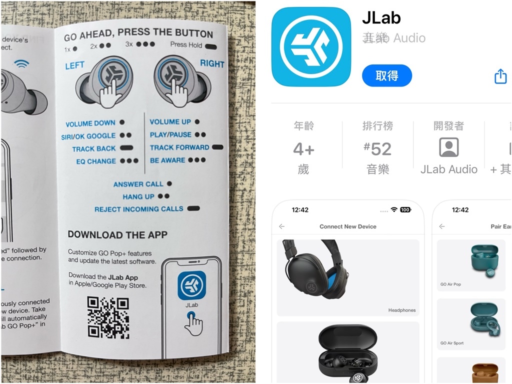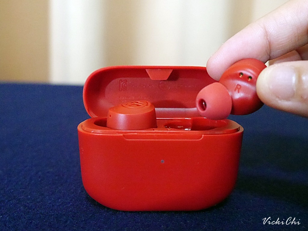 耳機上印有JLab圖騰的亮面浮雕logo字樣,耳機可以雙耳機連線模式,支援單耳使用。輕觸耳機便可以調整音量、可連接智能助理google及siri、音樂播放操控,全觸控式的操作,在使用上非常直覺性,即使是第一次使用很快就能上手。