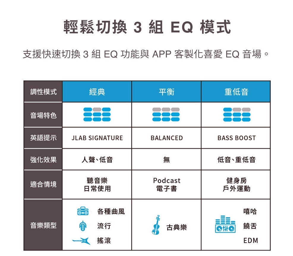 JLab Go POP+內建3種EQ等化器,分別為預設的經典 (JLab Signature),以及平衡、低音增強模式,還可以自己調整EQ等化器。