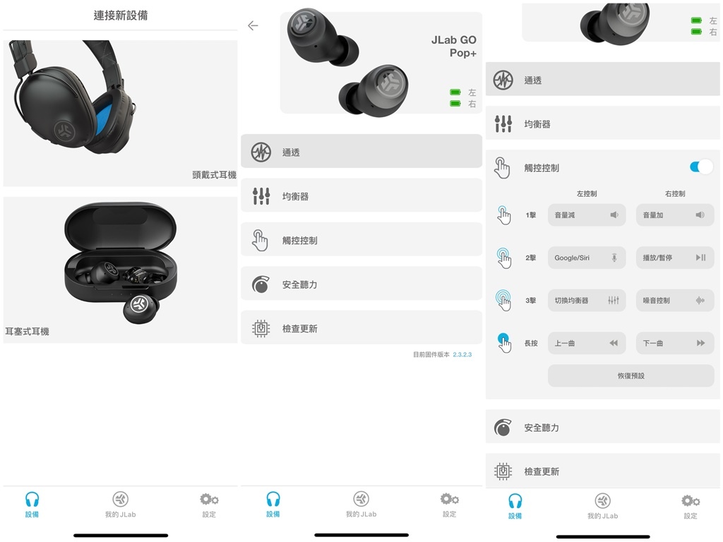 JLab Go POP+連線蠻快的,一開手機藍牙,耳機就馬上可以連線,支援Google Fast Pair(適用Android)。除此之外,打開專屬APP,可以調整設定,而通透模式,支援環境音聆聽,APP可控制強弱和調整最大音量,保護耳朵。