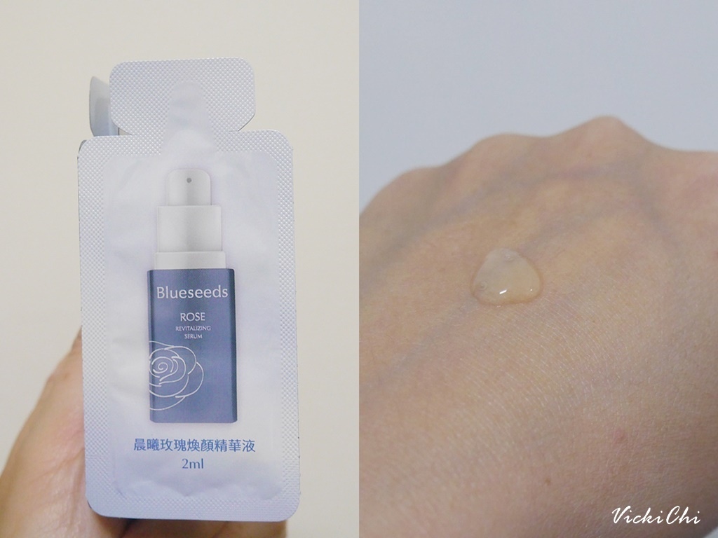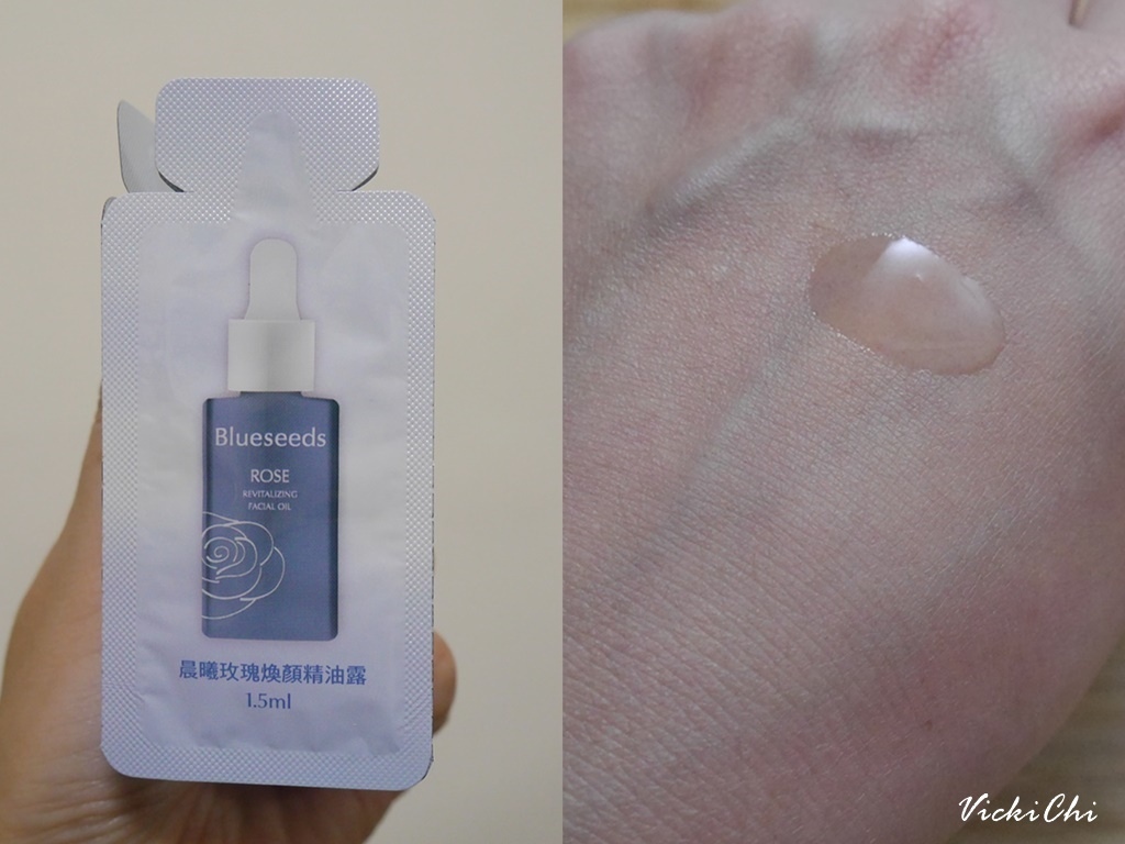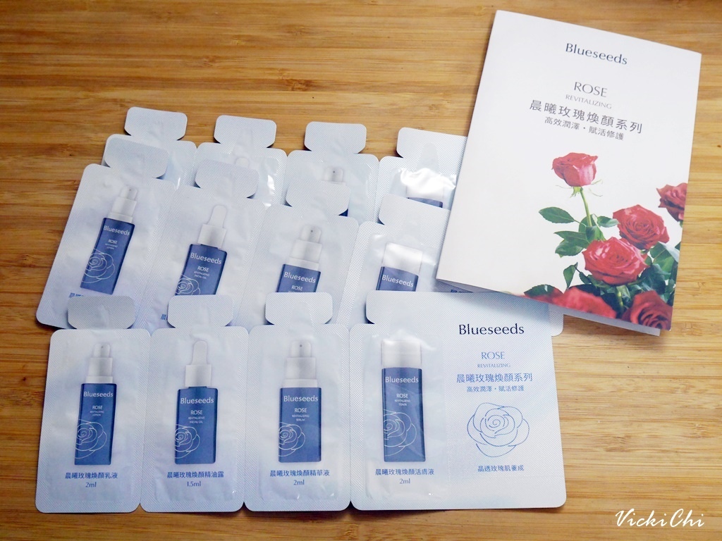 這次收到Blueseeds 晨曦玫瑰煥顏保養系列活膚液、精華液、精油露、乳液三日份的試用包和一瓶精油露使用看看。