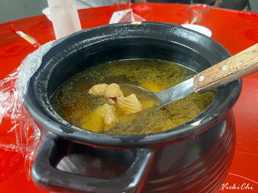 跟團的好處就是一進入包廂,桌上已經擺好雞湯。我覺得湯有點油,但蠻好喝的。雞肉吃起來普普,苦瓜吃起來不會苦,鳳梨則帶點酸甜感。