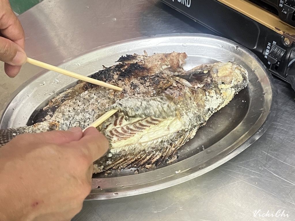烤魚外皮裹滿鹽巴,吃的時候把魚皮劃開,魚肉吃起來非常鮮嫩,可以沾點胡椒鹽提味,但我覺得不沾醬料,原味就很好吃了!
