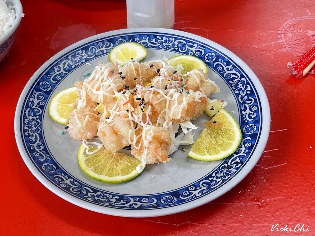 這道菜根本就是合菜的經典款,白蝦底下鋪滿了酸甜的鳳梨片,淋上美乃滋,旁邊還搭配檸檬片。
