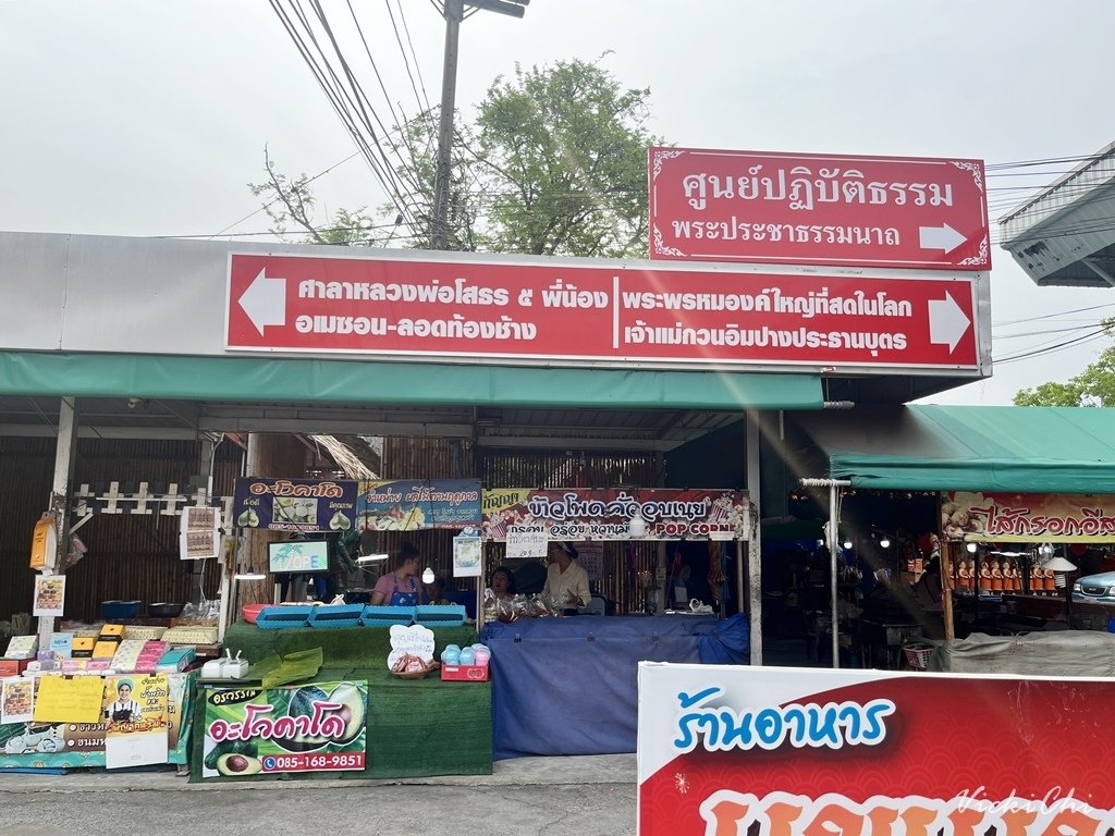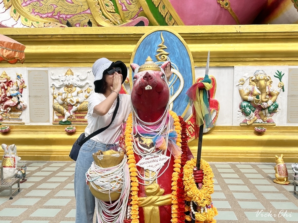 這座巨型臥姿象神建於2010年,高約16尺、寬達22尺,是目前泰國最大的臥姿象神。整尊以粉紅色為主調,色彩鮮明亮眼,搭配細緻的雕刻工藝,不只莊嚴又充滿藝術美感,遠遠看去就讓人忍不住多看幾眼。