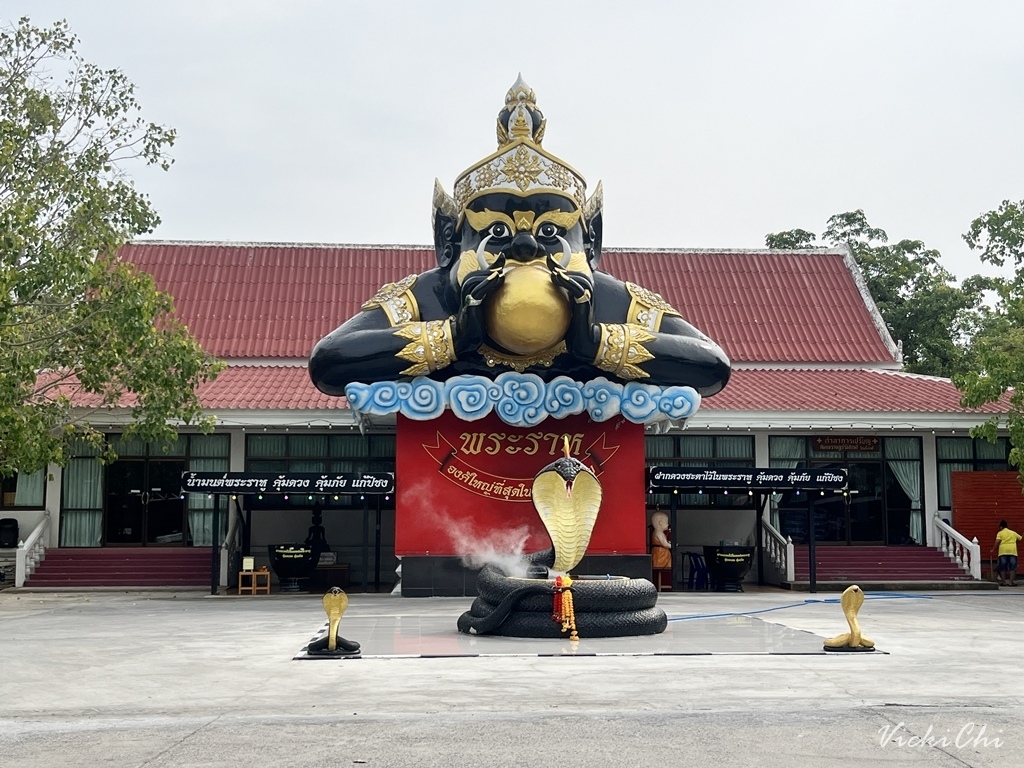 目前泰國最大的拉胡天神(Phra Rahoo),相傳拉胡天神被日、月神兩神陷害造謠而受苦,因此,祂非常嫉惡如仇。信眾可以向拉胡天神祈求防小人纏身、化解是非恩怨,由於拉胡天神喜歡黑色,所以祭拜的時候,通常以黑色系食物為主。