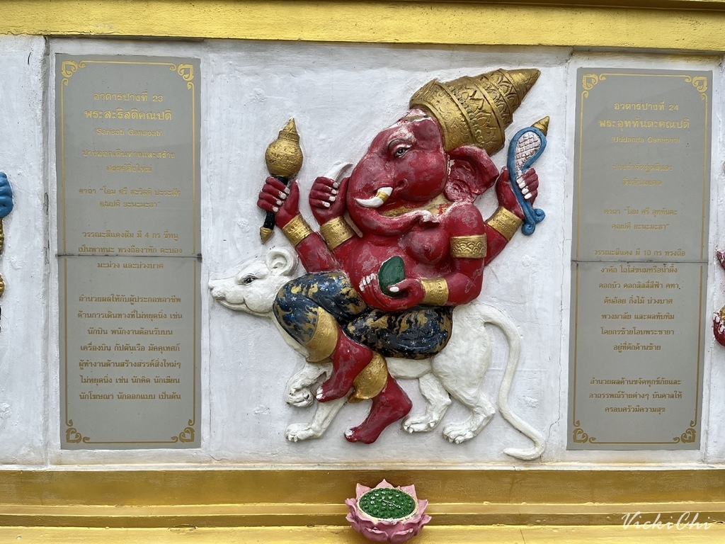象神的基座,牆上約有30多隻不同顏色、表情的象神雕像圍繞著,每尊雕塑超級細緻,旁有解說文,信眾繞行時都不忘了用手摸摸象神的鼻子與象牙來祈福。