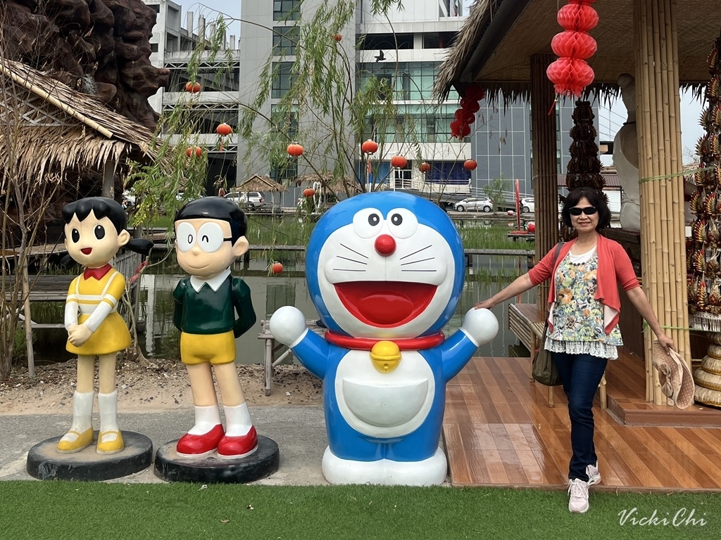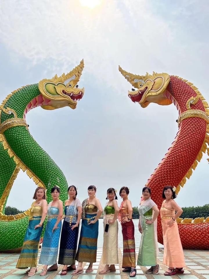 阿姨們紛紛換上泰服,在環繞河畔的巨龍龍王迦納前面拍照,一紅一綠非常絕配亮眼,雖然很熱,超級漂亮的。